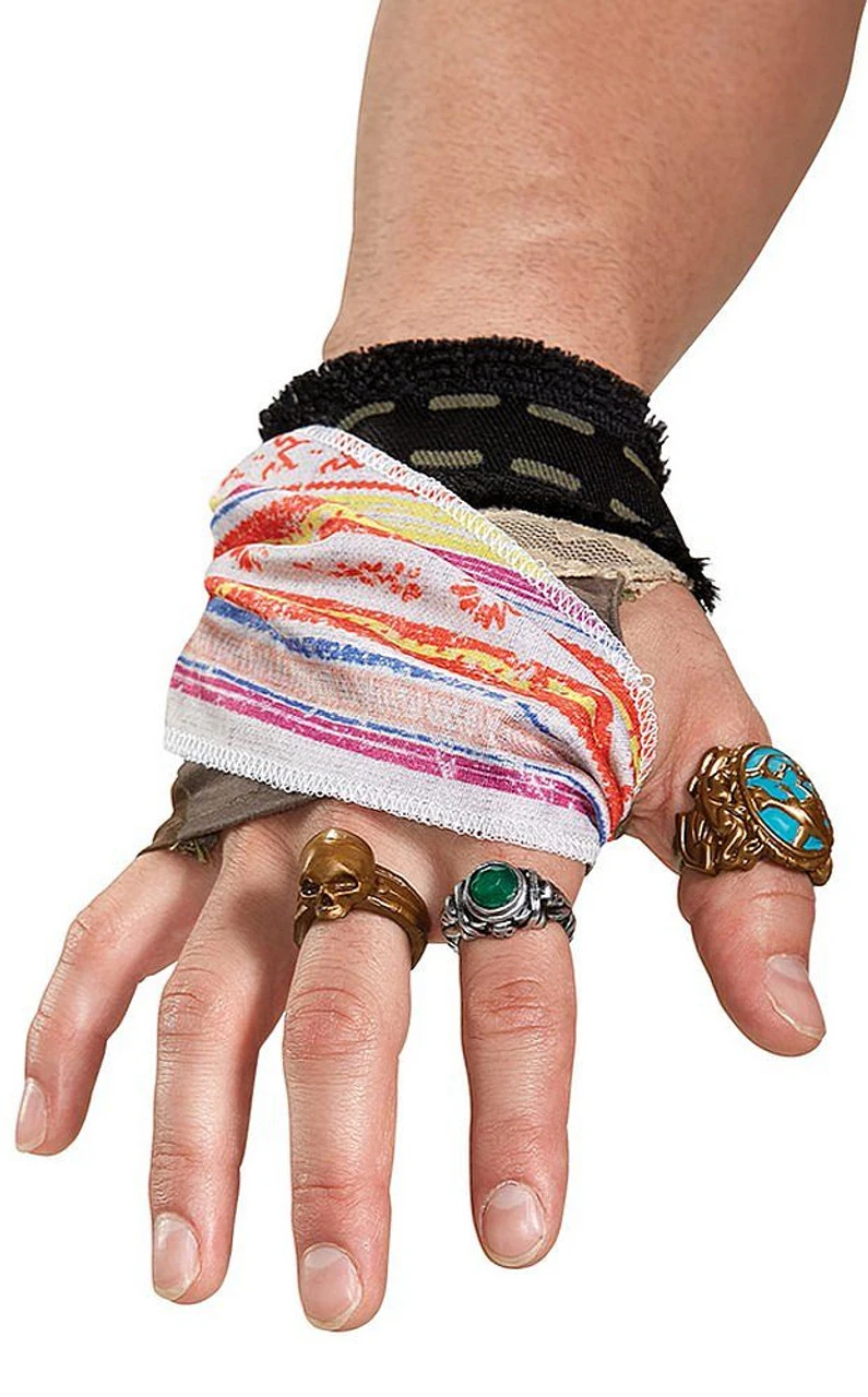 Tout est dans les dĂ©tails…Le costume de Pirate ou de Jack Sparrow ne serait pas complet sans ce kit dâaccessoires qui comprend trois bagues, un gant sans doigts marron, et des accessoires en tissus colorĂ©s pour enrouler autour des gants, achĂšvera la transformation en pirate.