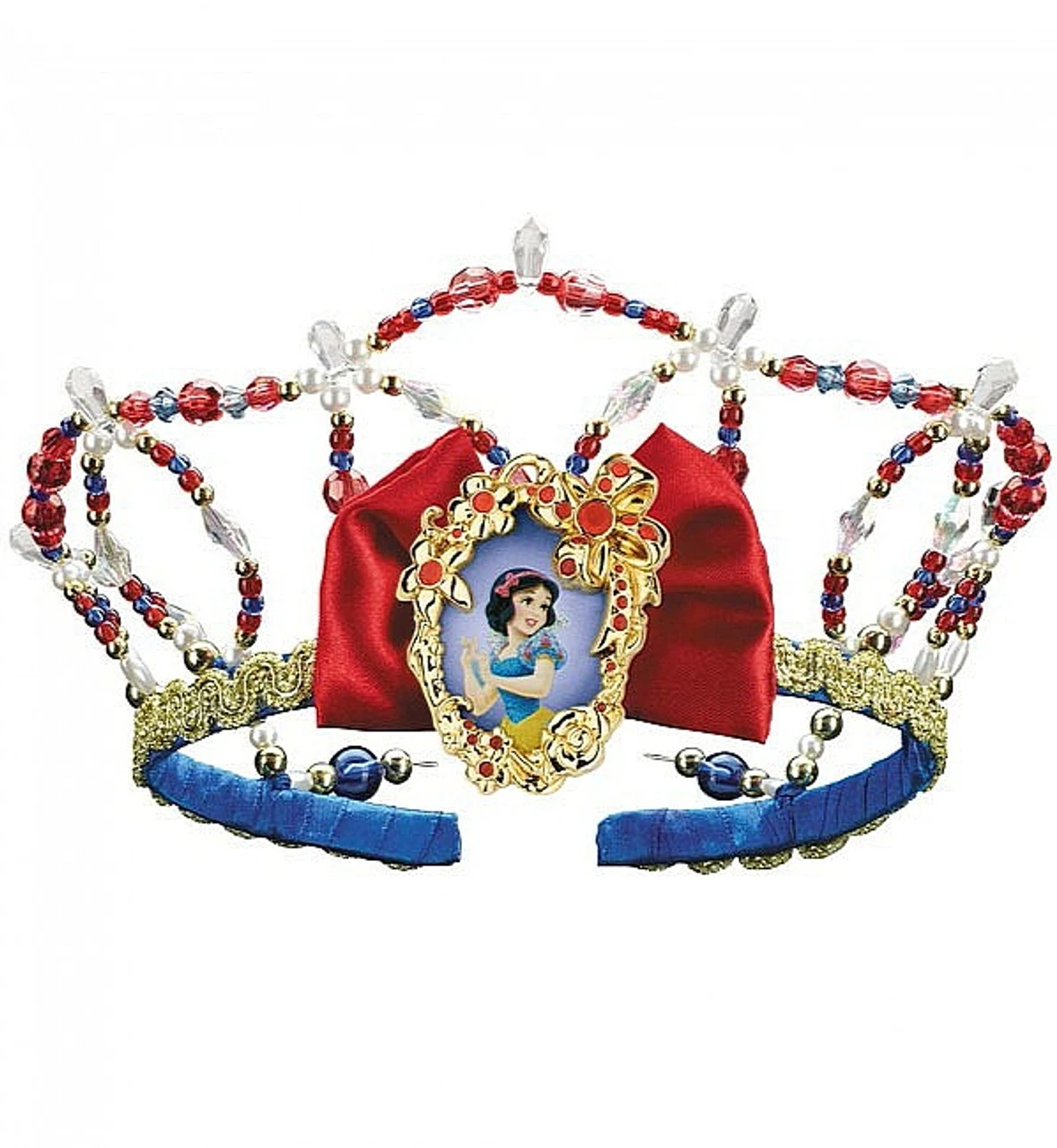 Enhances the Snow White costume beautifully! This Disney’s Snow White Tiara features red and blue beaded tiara style with Snow White cameo at center resting in red feathers with blue, red and gold band accentuated with plastic diamond ornaments and red marabou edge.