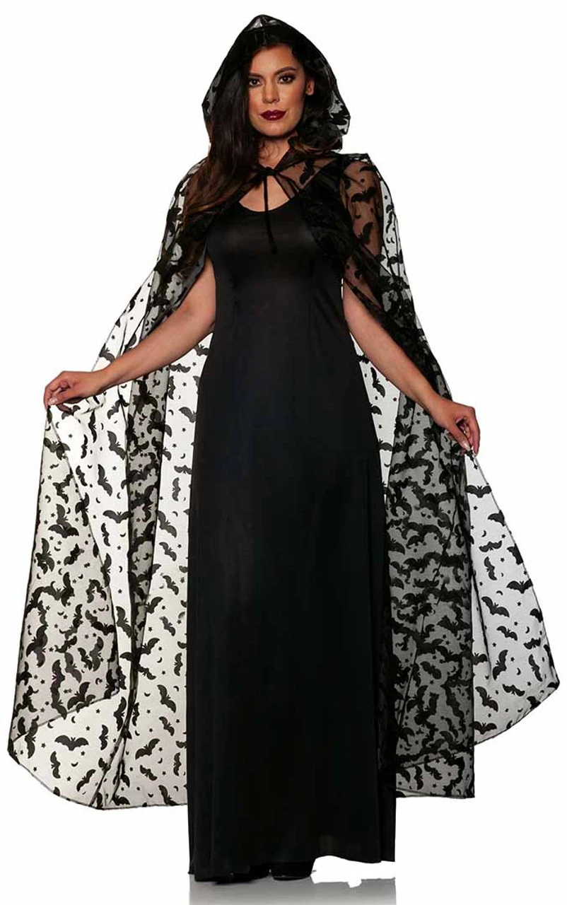 Charmez toute la nuit avec cet incroyable Costume Cape de Chauve-Souris pour Femmes! Cet accessoire luxueux comprend une cape noire transparente avec de petites chauves-souris imprimĂ©es partout et une capuche attachĂ©e pour un look Ă©lĂ©gant.Â