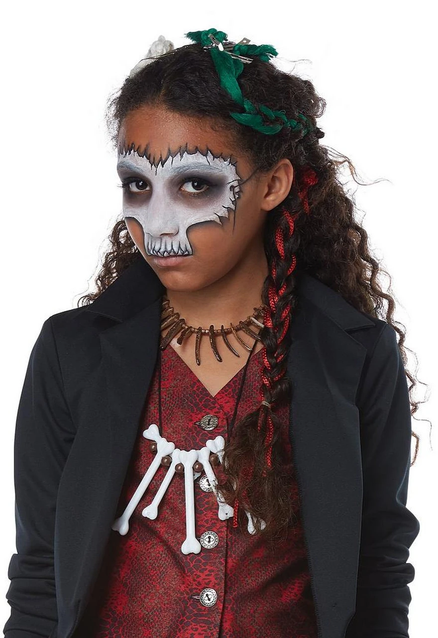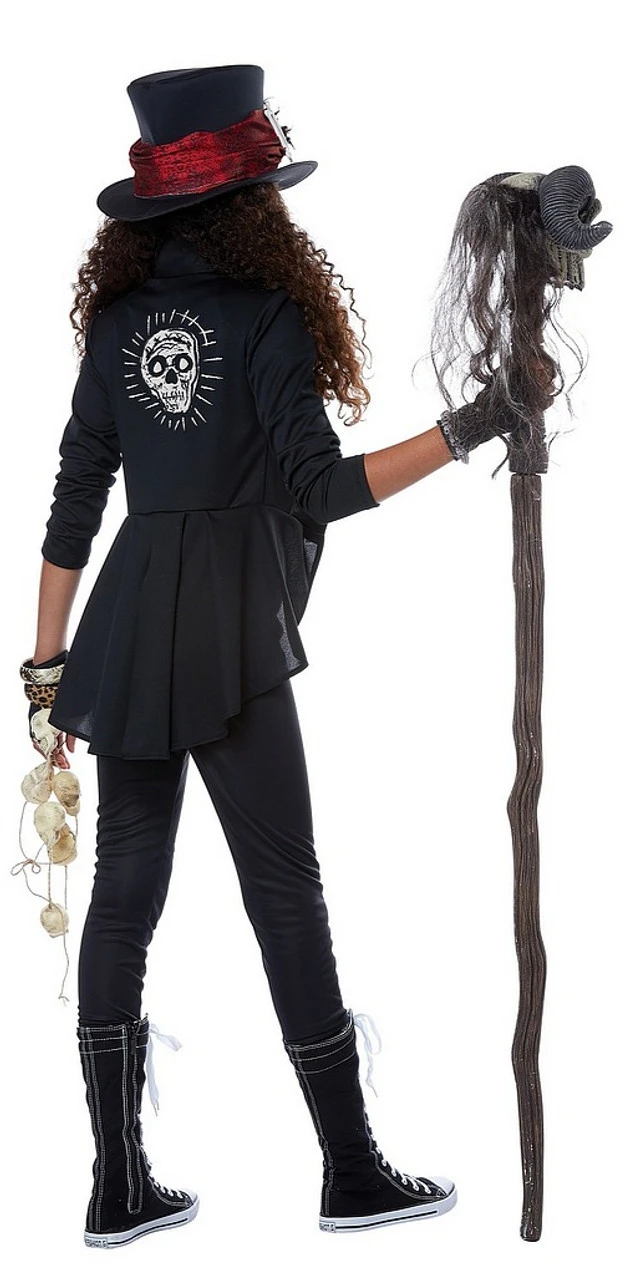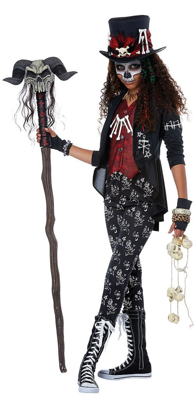 Ce costume Charme Vaudou pour préadolescent sera parfait pour la prochaine fête d’Halloween de votre enfant. Elle pourra se transformer en sorcière vaudou avec ce costume qui comprend un chapeau haut de forme noir décoré d’un crane et d’os, une veste noire décorée de symboles vaudous avec un veston rouge, un effrayant collier d’os, des gants sans doigts noirs, et des leggings noirs décorés de pentagrammes, de poupées vaudous et de symboles vaudous. Vous pouvez compléter ce costume de sorcière vaudou inspiré du vaudou de la Nouvelle-Orléans avec un peu de maquillage et un bâton de sorcier