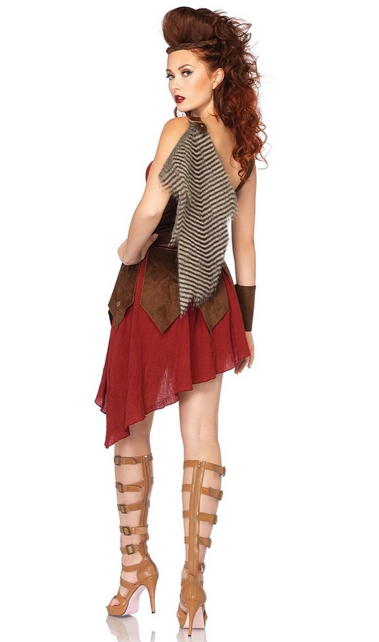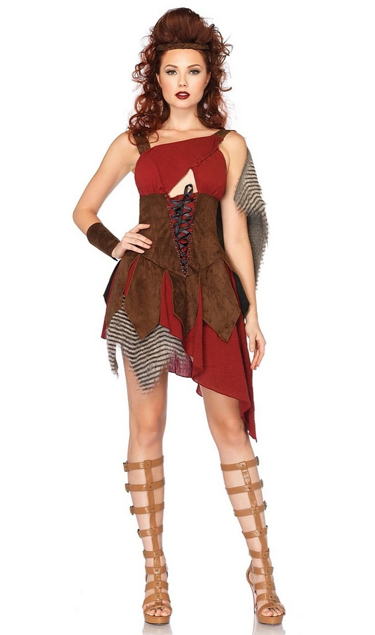 Capture the hearts of many as you parade in this stunning Deadly Huntress Costume! This fab number includes a crafty cut out hunter dress with lace up faux suede waist clincher and fur pelt accents, and accessorised with a wrist cuff and a nifty headpiece.