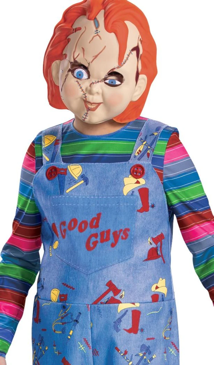 Voici un authentique costume de Chucky fait à la taille d’un enfant. Laisse Chucky effrayer tes amis et tes voisins. Peut-il être votre ami jusqu’à la fin ? Le costume classique de Chucky pour garçon comprend une combinaison en forme de salopette avec une chemise à rayures.La combinaison est bleue avec des motifs colorés partout et le logo « Good Guys » en rouge sur la poche avant. Le masque a un visage de couleur chair avec des cicatrices texturées peintes en rouge et des coutures noires. Il se caractérise par des yeux bleus peints et une bouche ricanante avec des dents et une ouverture découpée pour les yeux.