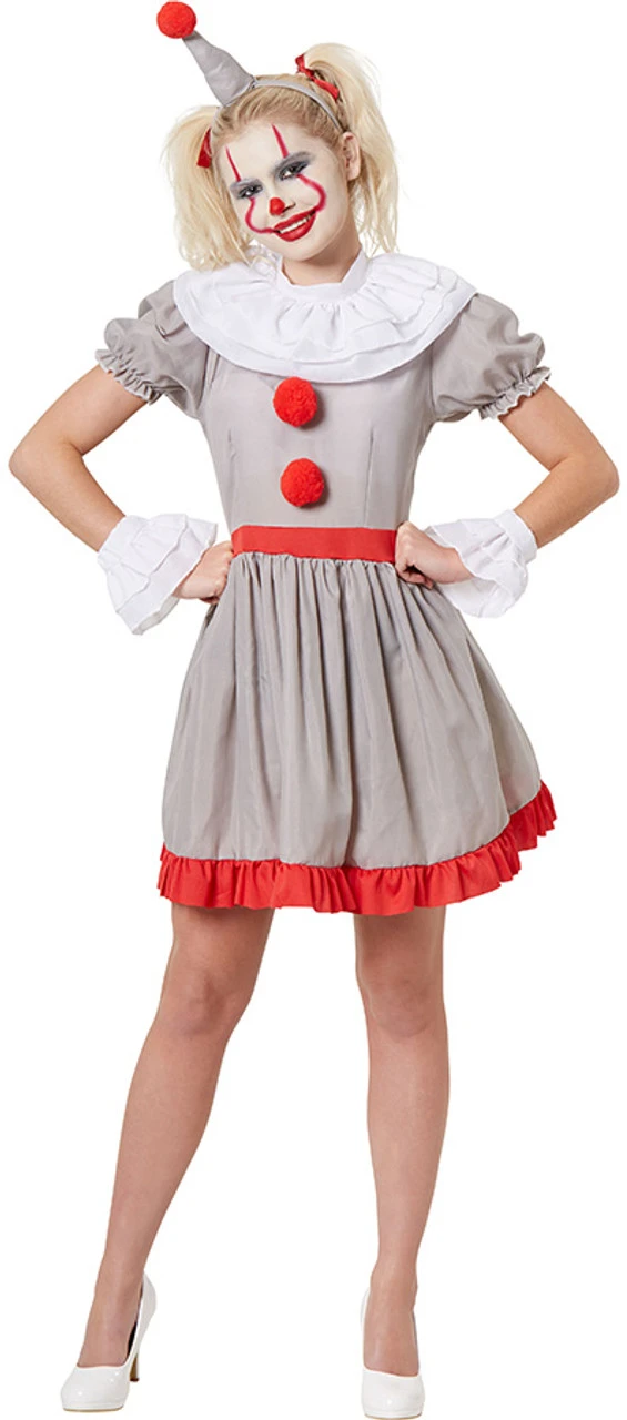 Tout le monde autour de vous sera effrayĂ© dans ce costume de Clown Horrifique pour Femmes inspirĂ© de Penny! Ce costume effrayant comprend une robe gris clair avec une taille rouge, des pompons rouges dĂ©taillĂ©s au milieu des manches courtes bouffantes et un col Ă volants blanc. La jupe de la robe a un bord rouge pour un look cohĂ©rent. De plus, le costume est accompagnĂ© d’un serre-tĂŞte assorti avec un mini chapeau pointu avec un pompon rouge sur le dessus et des volants blancs pour les poignets. Vous serez le clown le plus inquiĂ©tant dans ce costume pour la saison d’Halloween!Â