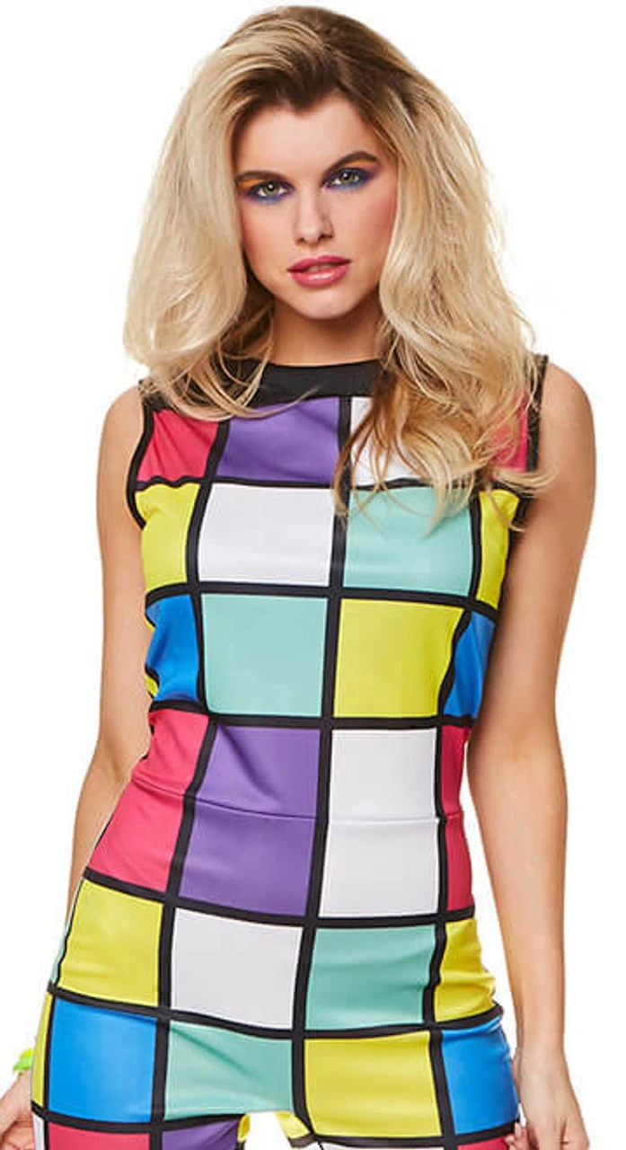Soyez la vie de la fête et faites tourner les têtes dans ce Costume Combinaison Années 80 pour Femme! Dansez toute la nuit dans cette combinaison éclectique sans manches ornée d’un motif de carrés aux couleurs vives partout. Ajoutez du maquillage néon et coiffez vos cheveux haut et fort pour un look totalement années 80!