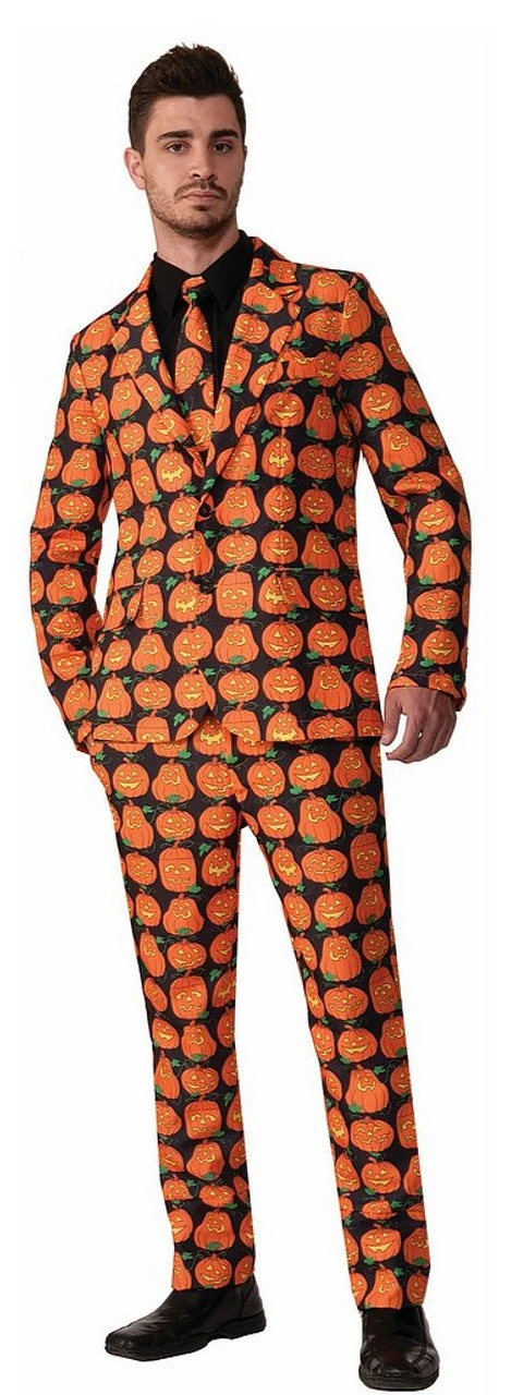 Orange you pumped for Halloween? This fun, pumpkin patterned suit features a jacket with a grinning jack-o-lanterns pattern, matching pants, and a matching tie, and will be perfect for a Halloween party.