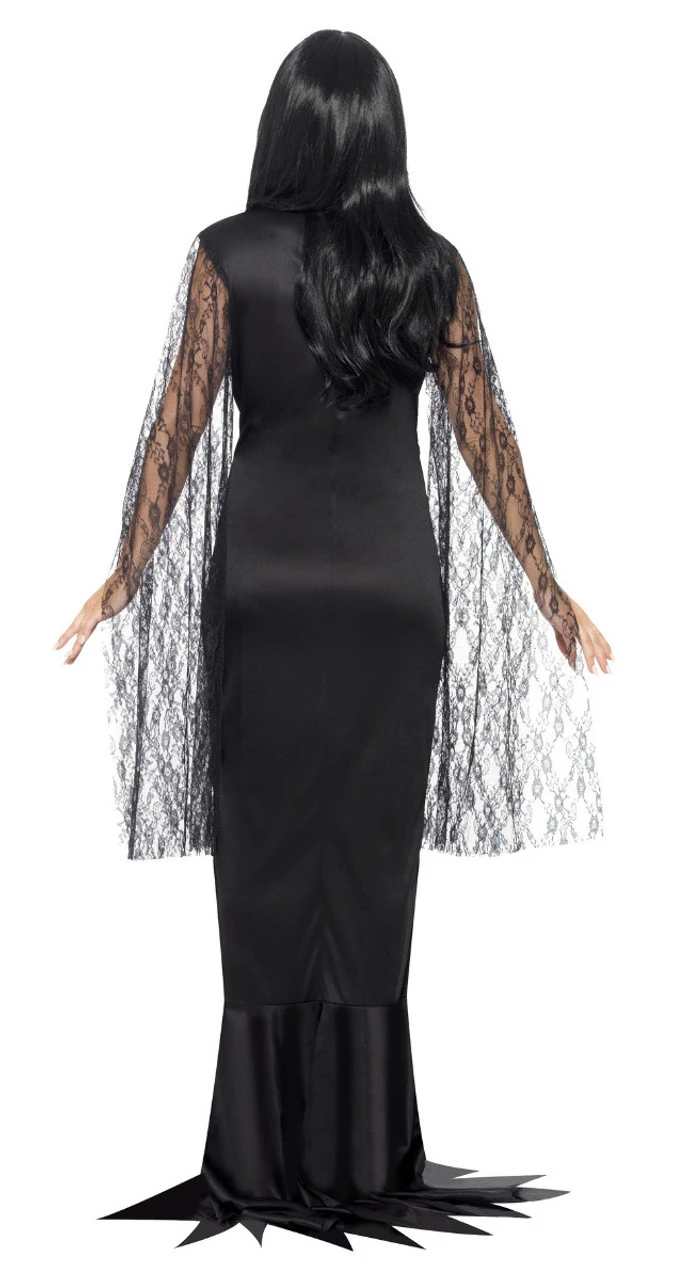 Ce magnifique Costume d’Âme Immortelle pour Femme sera parfait pour un Costume de Morticia Addams, un costume de vampire, ou un costume de sorcière. Il comprend une robe longue et noire à encolure en V avec une jupe fendue et des manches en dentelle. La robe est assez longue pour avoir une sorte de traîne qui vous donnera vraiment l’impression d’être Morticia!