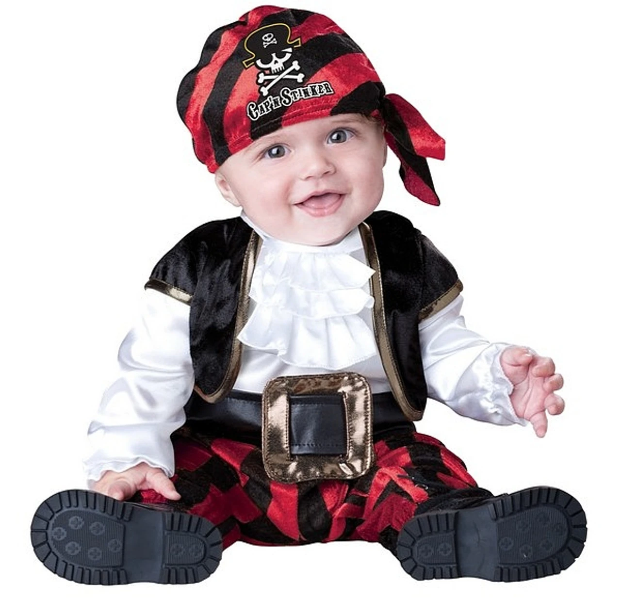 The Cap’n Stinker Pirate Infant Costume is a comical and cute costume that will amuse all at the party and will make your little one of the stars. The jumpsuit mimics a white flared shirt with attached black vest, large belt and flared striped trousers. The snap for easy diaper access makes the costume quite practical. The matching cap is sweet and at the same time comical with the Cap’N Stinker message. Now this pirate is ready to steal all the gazes with his cute smile.