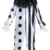 Etait-ce un cri ou un rire? Ce Costume de Clown Effrayant pour Fille sera parfait pour Halloween ! Il comprend une robe noire avec un col à poids froncé, un imprimé à poids representant des clowns sur les cotés, deux pompons (un rouge et un blanc) sur le devant, et des manches noires transparentes. Le costume comprend également un jupon noir à poids blancs assorti au col, ainsi qu’un chapeau pointu à poids avec un pompon et des frous-frous à poids, ainsi que des chaussettes rouges imprimées.
