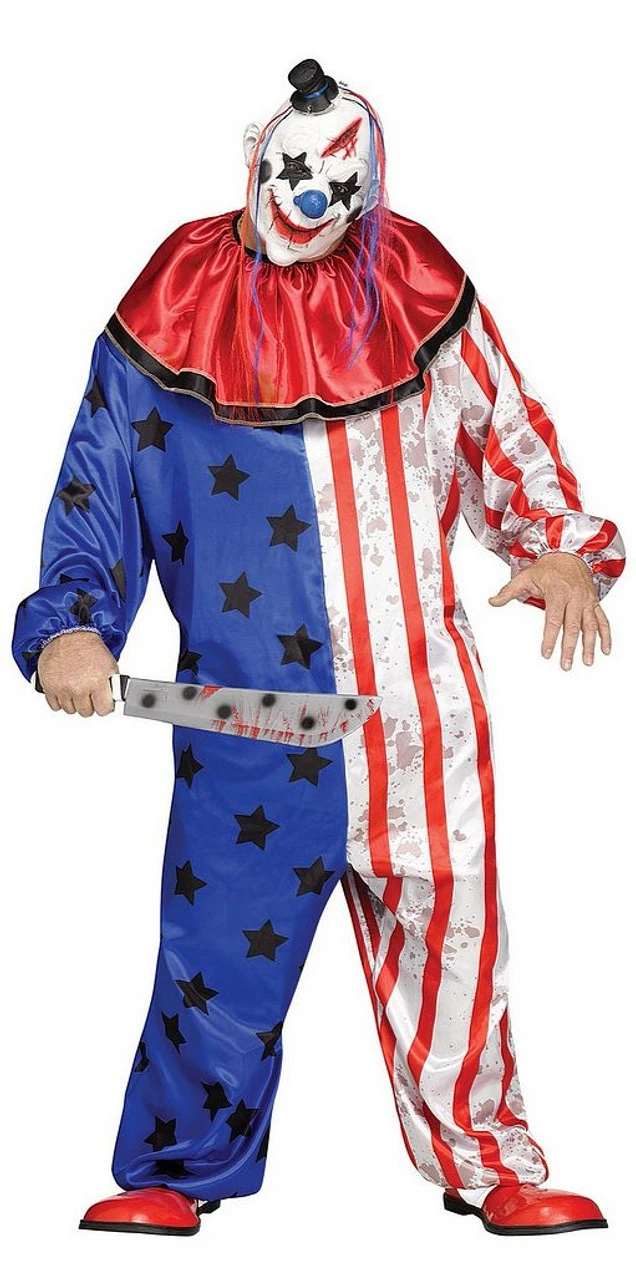 Bienvenue au cirque… Portez cet effrayant costume de clown pour un spectacle inoubliable! Le Costume de Clown Maléfique Grande Taille comprend une combinaison aux couleurs du drapeau américain, avec des étoiles noires sur un fond bleu d’un coté, et des rayures blanches et rouges avec des taches de sang. Le costume comprend également un col rouge avec une bordure noire, et un terrifiant masque de clown avec des étoiles peintes sur les yeux, des craquelures sur la bouche, un nez de clown bleu, une blessure sur le front, et un mini chapeau haut-de-forme avec des mèches de cheveux rouges et bleues.