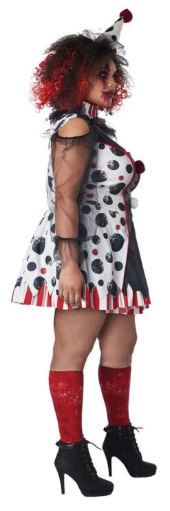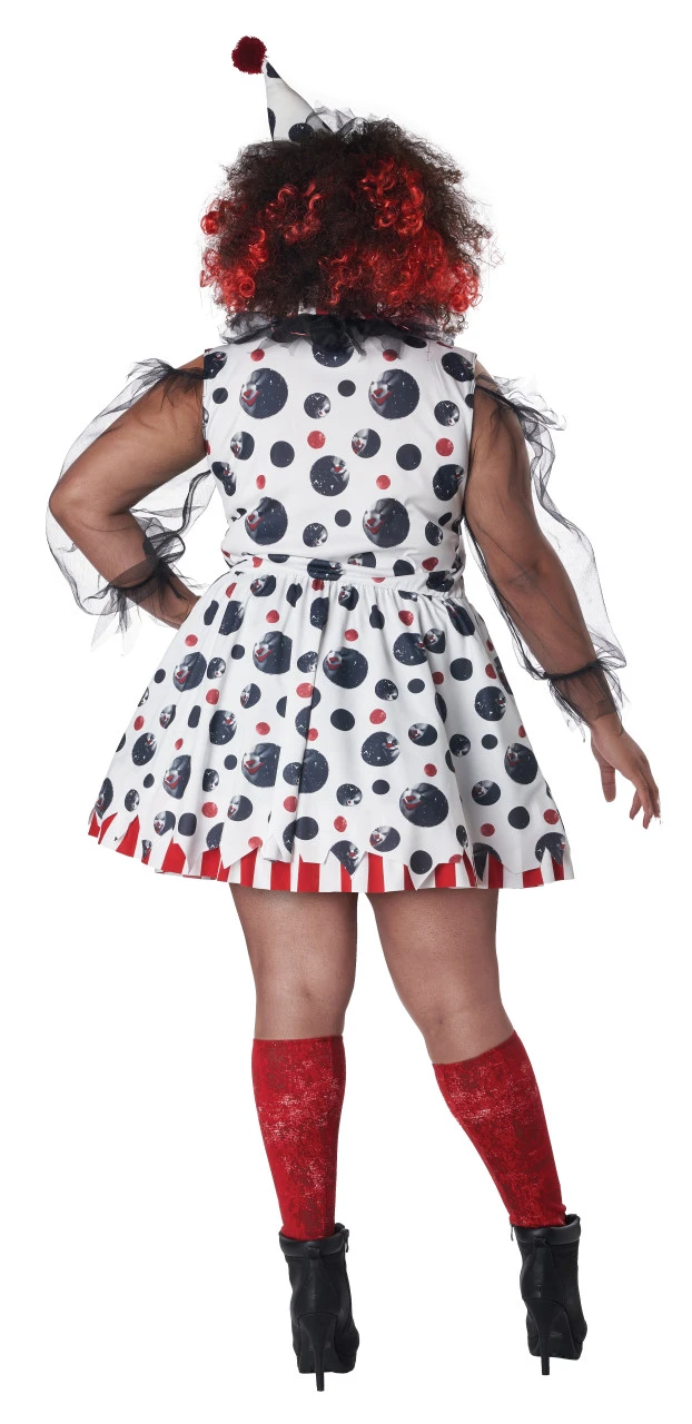 Pennywise nest pas le seul clown effrayant ici: regardez ce terrifiant Costume de Clown Tordu pour Femme! Voici un clown que vous ne voudrez pas rencontrer en vrai. Effrayez vos amis avec ce costume de clown, qui comprend une robe trapèze noire, blanche, et rouge avec des pois imprimés représentant des clowns sur les cotés, et deux pompons (un rouge et un blanc) au milieu, ainsi que des manches transparentes, un col froncee à rayures rouges et blanches, et un jupon assorti. Le costume comprend egalement un chapeau de clown assorti et une paire de chaussettes imprimees.