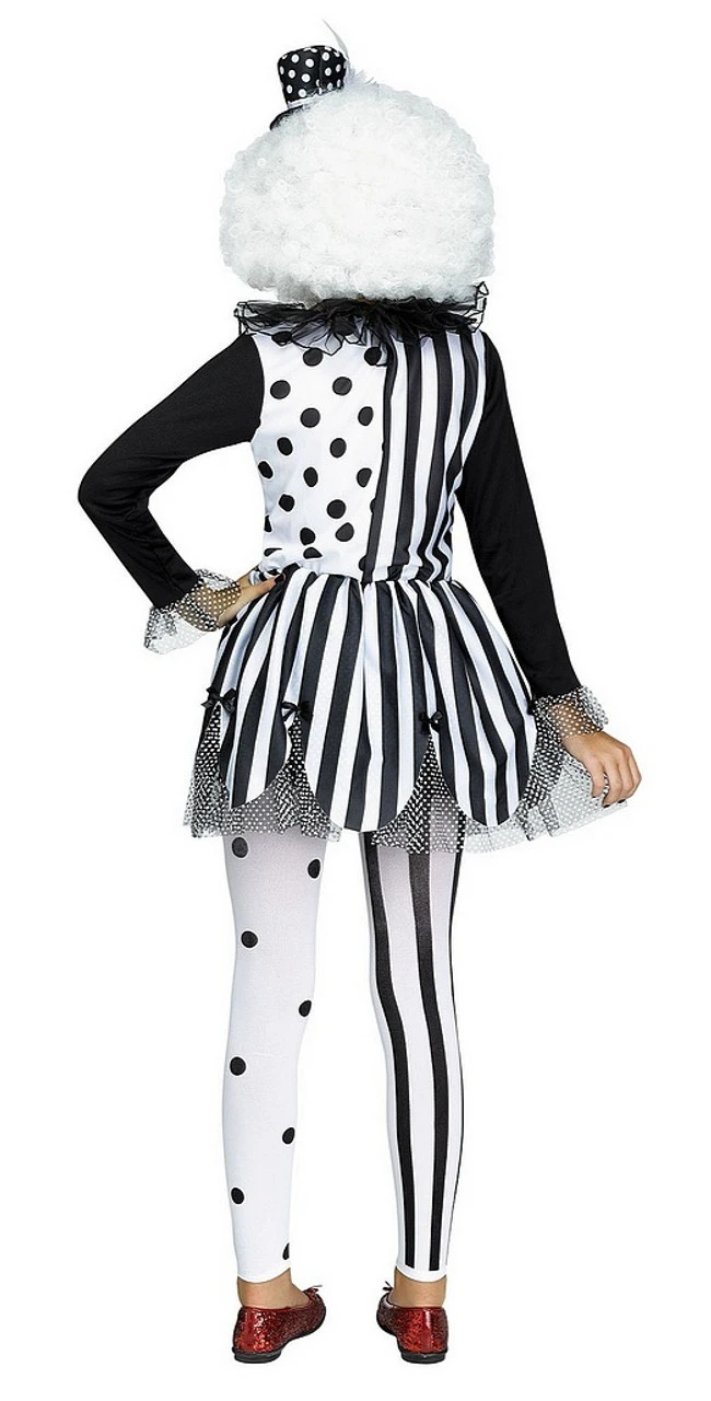 Bienvenue au cirque! Ce Costume de Clown Tueuse pour Fille sera parfait pour Halloween : après tout, quoi de plus effrayant qu’un clown malĂ©fique ? Le costume comprend une robe noire et blanc avec un pompon et une jupe style tutu et un col noir. Il comprend aussi un mini chapeau haut de forme avec une plume et des collants sans pieds. Sans arme et maquillage peureuse, ce costume fera tres bien comme un jester.Â