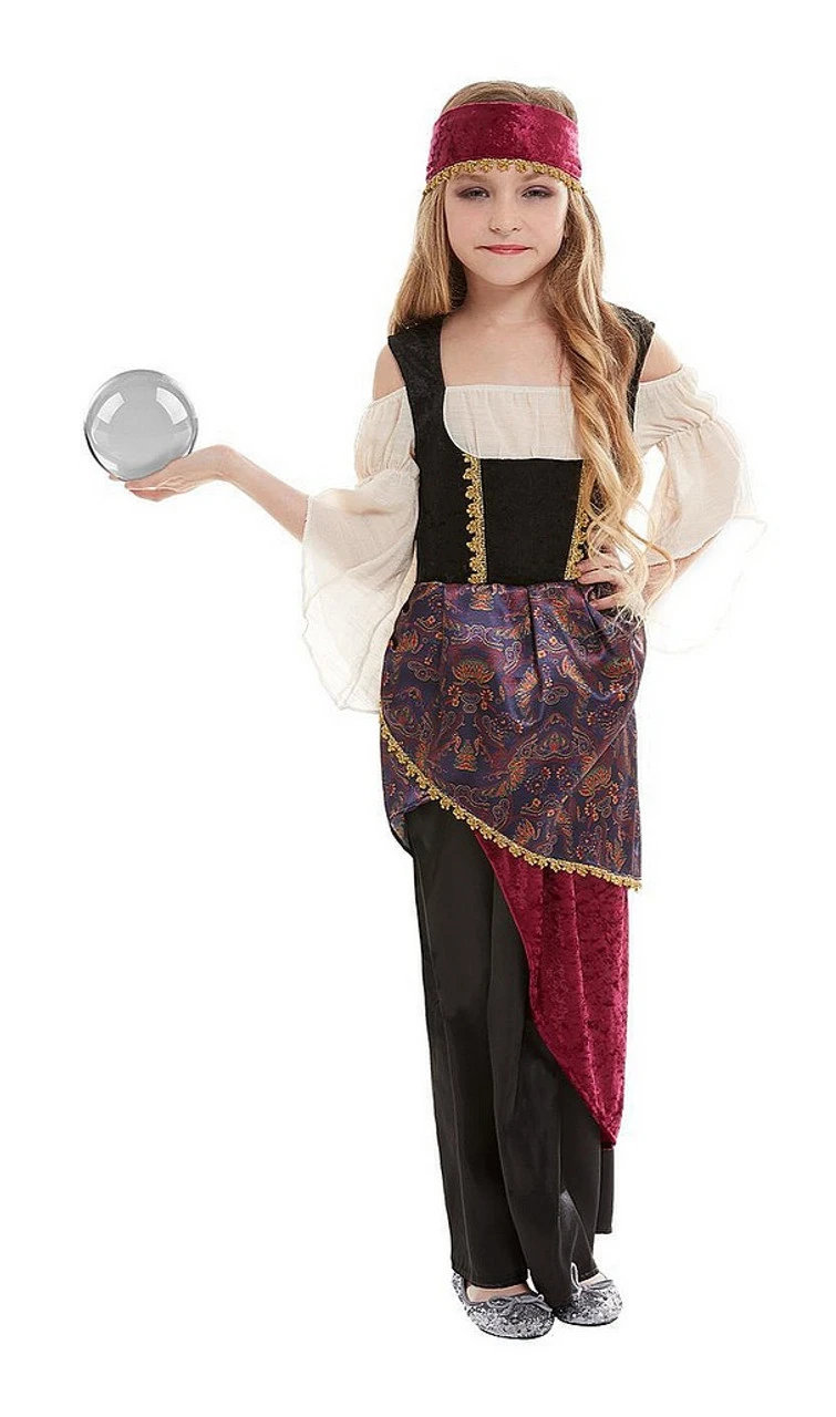 Je vois dans ton futur une fantastique soirée d’Halloween! Déguise toi en diseuse de bonne aventure avec ce joli costume qui comprend une longue robe noire avec des détails dorés et des superpositions en tissu coloré sur la jupe, ainsi qu’un foulard pour la tête avec une bordure dorée.