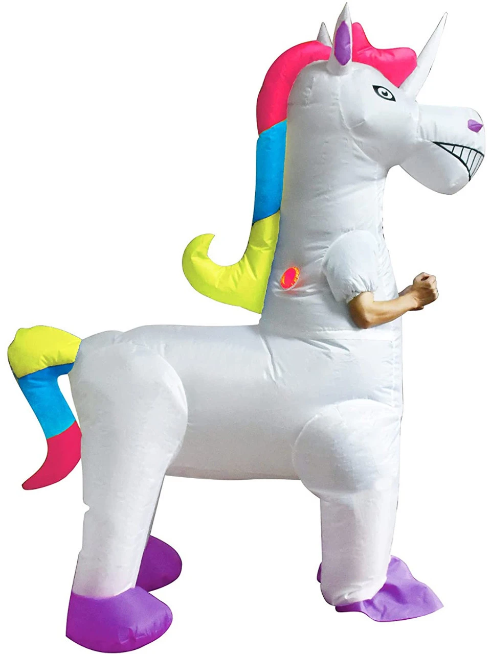 Bondissez dans cette licorne gonflable blanche pour un Halloween magique ! Cette licorne gonflable est tellement amusante qu’elle fera tourner toutes les tĂȘtes. Elle reprĂ©sente une licorne blanche gonflĂ©e avec un sourire sur le visage et une criniĂšre et une queue aux couleurs vives de l’arc-en-ciel. Le costume est livrĂ© avec un ventilateur alimentĂ© par des piles (non incluses) qui gonfle le costume. Les jambes avant seront les vĂŽtres tandis que la moitiĂ© arriĂšre de la licorne gardera sa forme grĂące au flux d’air. La tĂȘte est dotĂ©e d’un petit trou pour offrir une bonne visibilitĂ© lors de la majestueuse balade.Â