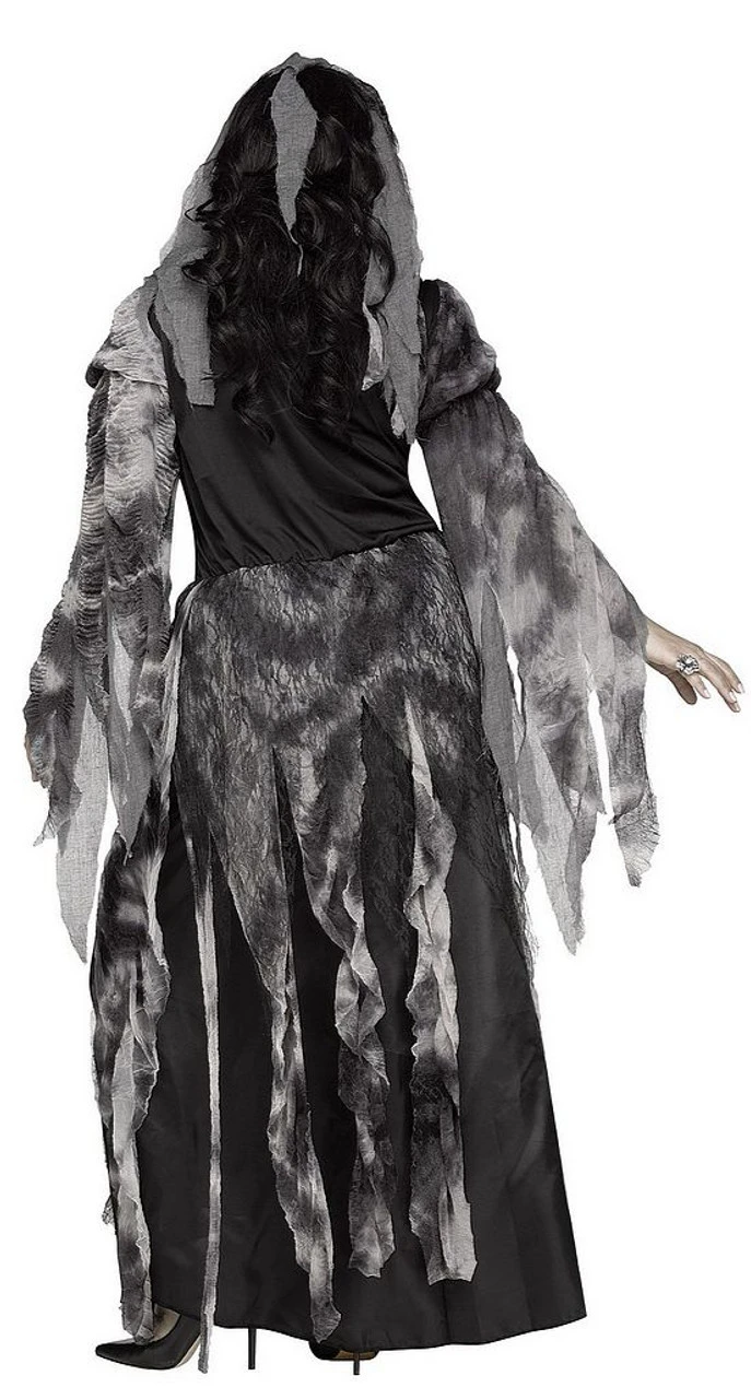 Vive la mariée! Devenez une effrayante Mariée du Cimetière avec ce magnifique costume! Il comprend une longue robe aux épaules dénudées, avec un corsage a lacets noir décorée de dentelle noire, et une jupe noire avec une superposition en lambeaux qui a l’air d’avoir été tachée de sang ou de boue, des manches cascades assorties, et un voile gris en lambeaux sur un serre-tête avec des fleurs. Le haut du corsage est assorti à la superposition de la jupe.