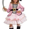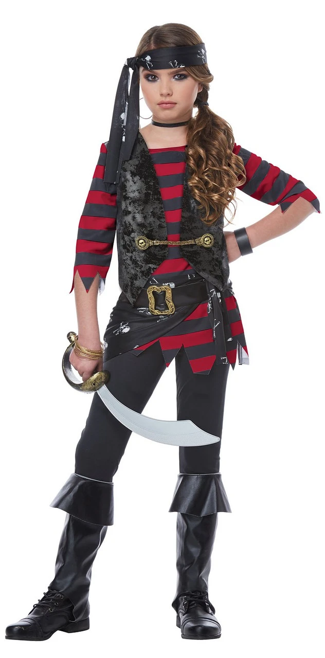 Yo oh oh! Ce costume de Pirate Regénat pour fille, qui comprend un t-shirt rouge et bleu avec des manches déchirées, un veston noir avec deux médaillons décorés de têtes de morts et une chaîne dorée, un bandeau noir avec des têtes de mort et un foulard pour la taille assorti, des couvres-bottes noirs, et une ceinture noire avec une boucle dorée, permettra à votre petite fille de jouer avec ses amis pirates et de piller les mers.