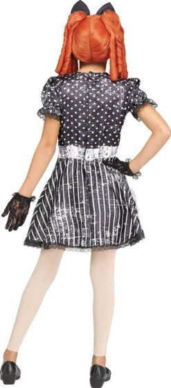 Votre petite fera une déclaration effrayante lors de son prochain concours de costumes ou de sa prochaine maison hantée. Le Costume de Poupée du Grenier pour Filles comprend une robe noire avec de la dentelle noire sur le bas de la robe et sur les manches bouffantes avec des gants en dentelle assortis. Le col est bordé de dentelle blanche et le torse est orné d’un motif à pois avec deux gros boutons blancs. La jupe est rayée avec des accents de satin et de gaze. Le bandeau à gros nud, les collants sans pieds à motifs de poupée et la clé en feutre sur la boucle du poignet complètent le look.