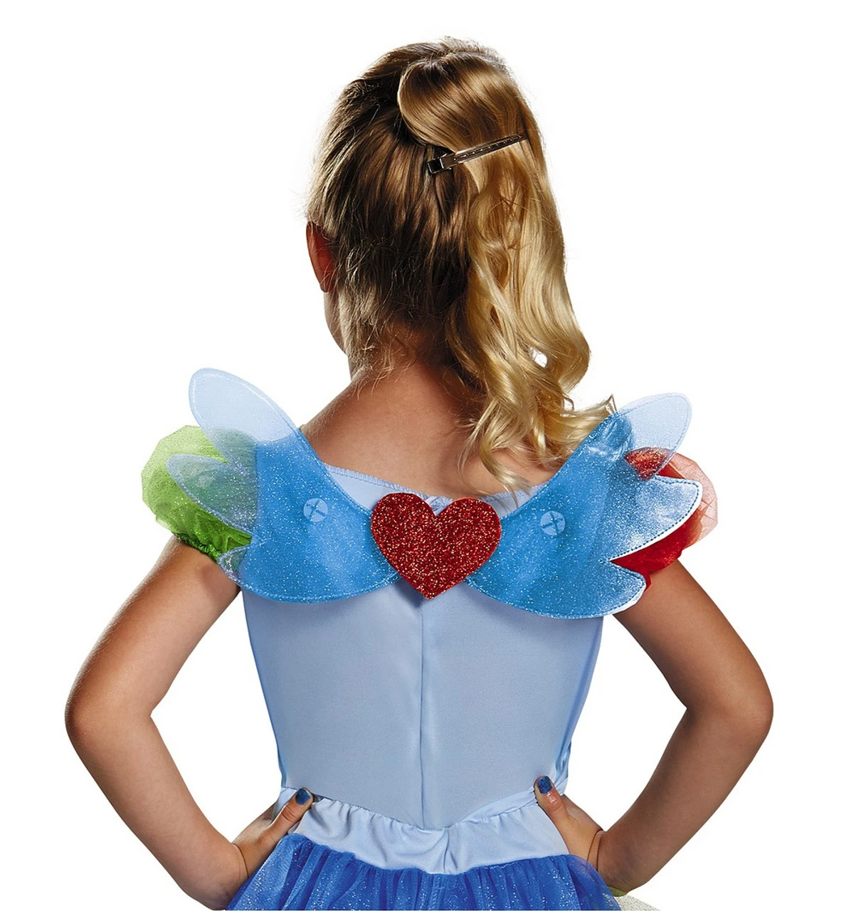 Les amies, c’est magique! Dans le populaire dessin animé Mon Petit Poney, Rainbow Dash représente l’élément de la loyauté. Espiègle et confiante en elle, Rainbow est une amie incroyable et une pilote hors-pair. Tu peux l’incarner avec ce Costume de Rainbow Dash Mon Petit Poney sous licence officielle! Il comprend une robe bleue chatoyante avec le portrait du personnage, dont la crinière est pailletée, une jupe bleue pailletée, des manches bouffantes rouges et vertes et pailletées, des pièces de tulle pailletées et multicolores, des ailes et une queue amovible, ainsi que des leggings bleus et un serre-tête de Mon Petit Poney assorti à la robe.