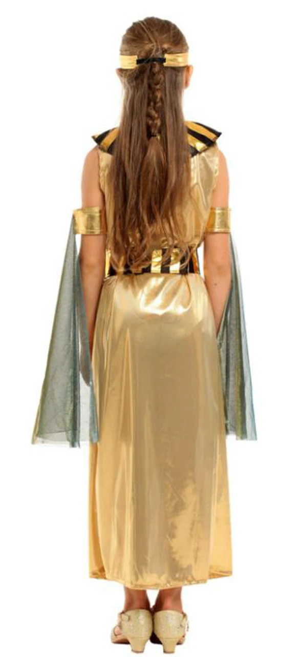 De princesse, vous serez promue reine de la reine Cléopâtre Girl costume. Ce costume flashy comprend une robe dorée, avec une grande ceinture noire et dorée, un col orné, deux manchons dorés avec un drapé noir transparent, et un bandeau doré. Cléopâtre n’a jamais été aussi spéciale, jusqu’à cet Halloween.