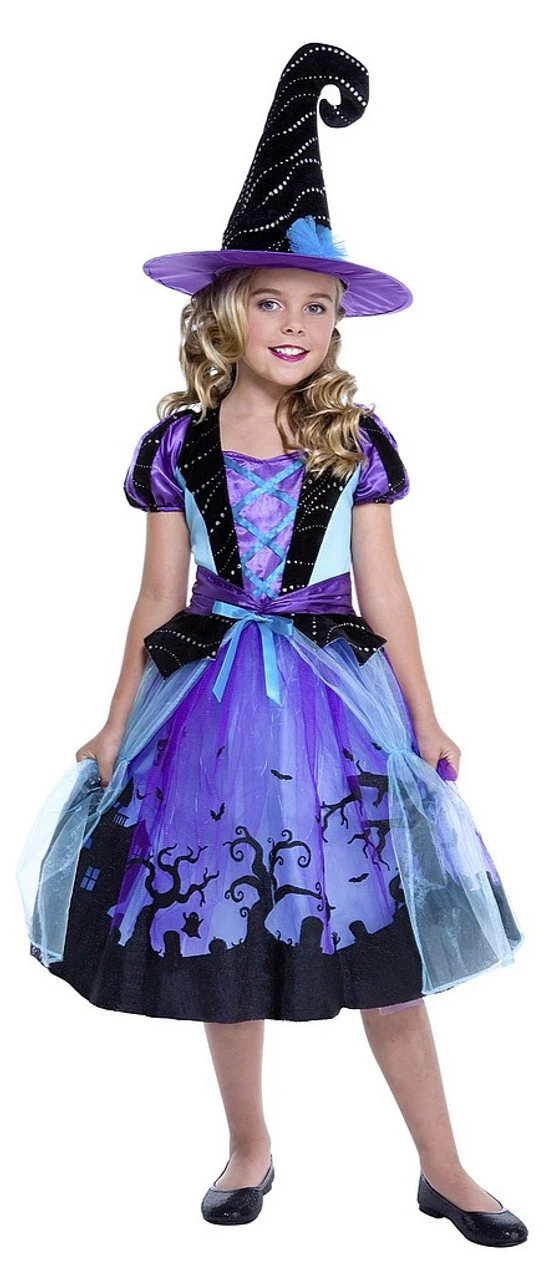 Votre petite fille ensorcèlera tout le monde avec ce magnifique costume de Sympathique Sorcière! Il comprend une jolie robe bleue et violette avec un faux corsage a lacets, des accents noirs, une superposition bleue transparente sur la jupe, des rubans violets et bleus à la ceinture, des manches bouffantes noires et violettes, et une image de cimetière sur le bas de la jupe, ainsi qu’un chapeau de sorcière noir et violet avec une plume bleue.