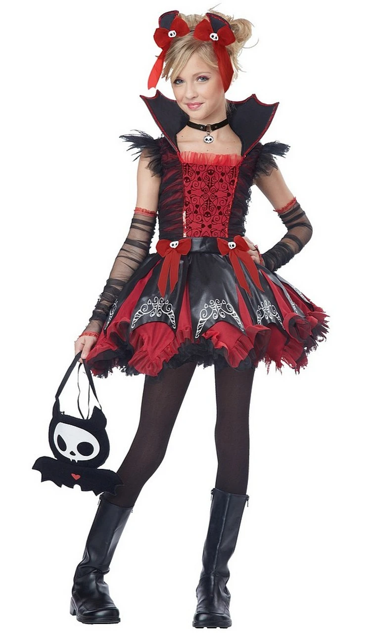 As night falls sheâll be ready to swoop in for sweet treats dressed in this sassy Diego The Bat Deluxe Costume. Perfect for tweens and kids, this ornate black and red gothic style dress features a striking upright bat collar and accented in tulle detailing with a playful layered tutu skirt. Red bows add a feminine touch to both the dress and charming bat ear headband while long sheer glovelettes complete her look. The coordinating cute bat backpack comes in handy as sheâs scavengers tasty candy!