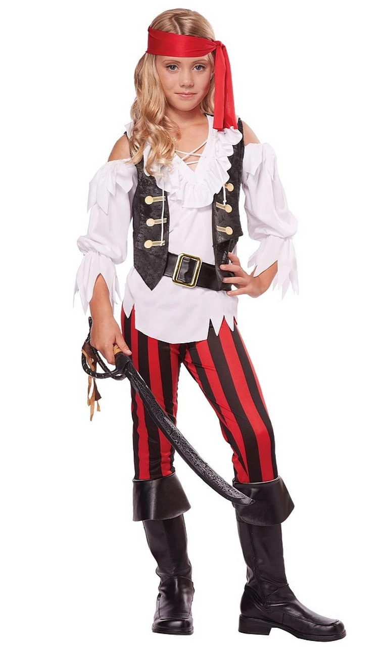What a hip pirate costume is the Posh Pirate Girl Costume. The outfit features a white off-the-shoulder shirt with zig zag hem, attached vest with ornaments, and black and red stripped leggings, making this a fun and comfortable outfit. The belt and head piece complete the look. Add a sword and some pirate make up to finish the look.