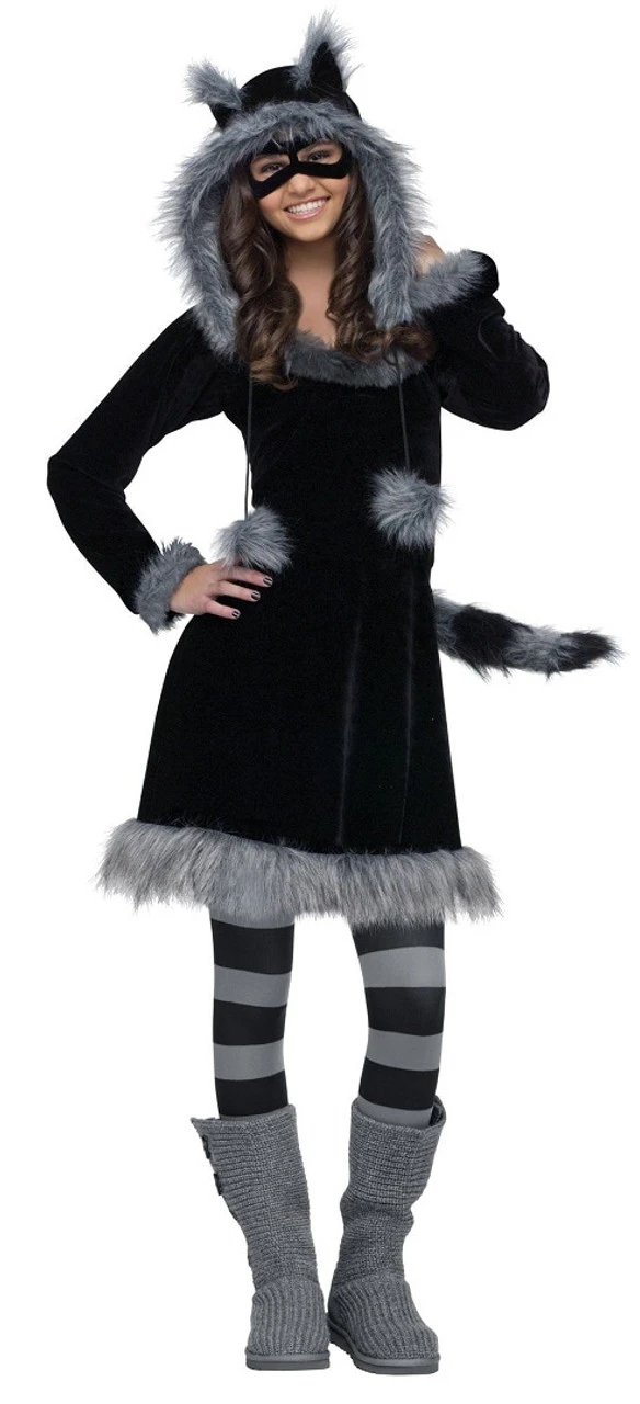 Votre fille aura assurĂ©ment l’air adorable quand vous lui offrirez ce Costume Doux du Raton laveur pour adolescents! Ce bel ensemble comprend une robe en velours noir avec une queue de raton laveur en peluche, une jolie capuche de personnage et des bordures en fausse fourrure sur les manches, l’encolure et l’ourlet. La capuche comporte une ouverture confortable pour le visage, une paire d’oreilles de raton laveur en peluche et un pompon en peluche. Ce Costume Doux du Raton laveur pour adolescents comprend Ă©galement un masque pour les yeux assorti et des collants rayĂ©s noirs et gris pour un ajout d’attrait. Parfait pour Halloween, le costume lui-mĂŞme est fabriquĂ© dans une matière douce et confortable, qui isole le corps sensible de votre fille du froid. Alors, apportez cette tenue Ă la maison et laissez votre fille passer une nuit inoubliable avec cette superbe tenue de fĂŞte!