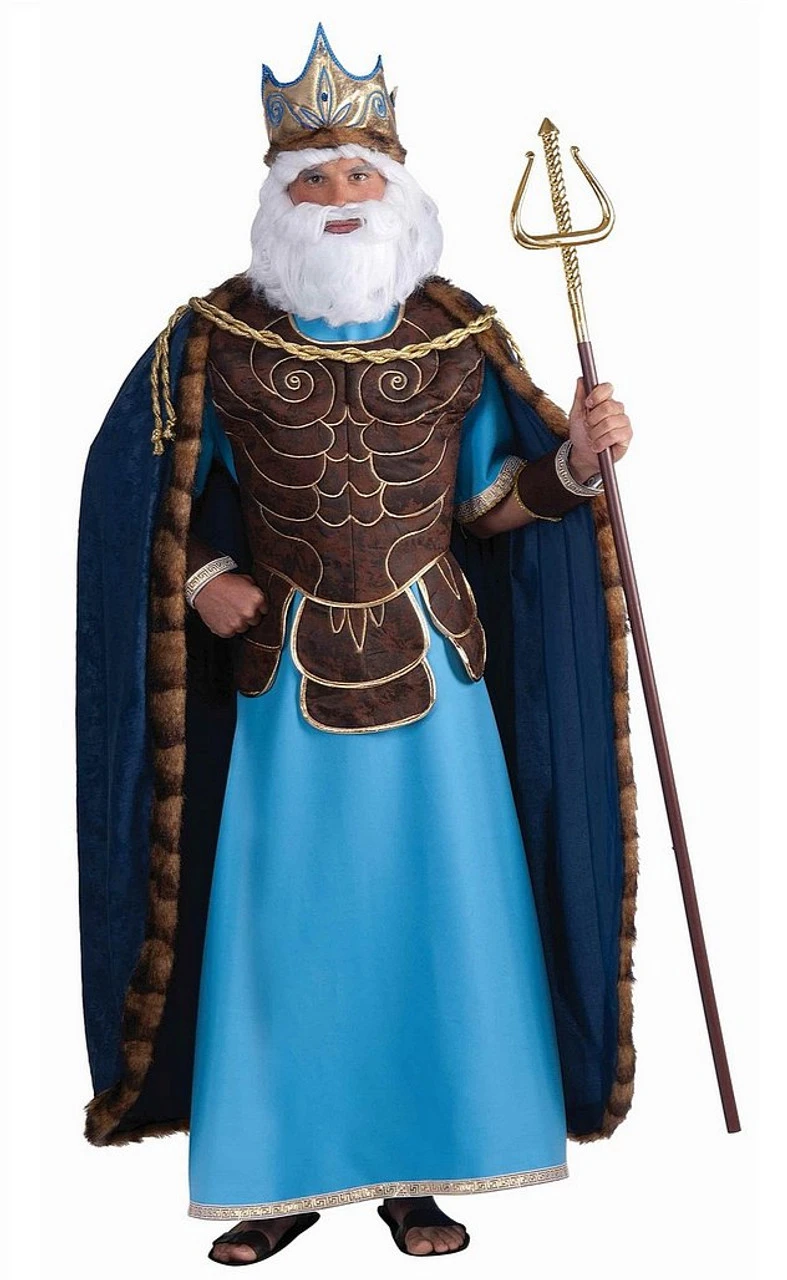 Rule the deep waters, the furious waves and all the sea creatures and maybe sway some mermaids this evening with the King Neptune Costume. The chest piece has beautiful detailed classic golden prints that resemble an armor and matching golden hemline which is balanced by the matching wrist cuffs. The deep blue cape with rope design hemline flows lightly like water on the shoulders and is complemented by the golden rope decoration. The King Neptune Costume is completed by the beautiful golden crown headpiece with blue notes.