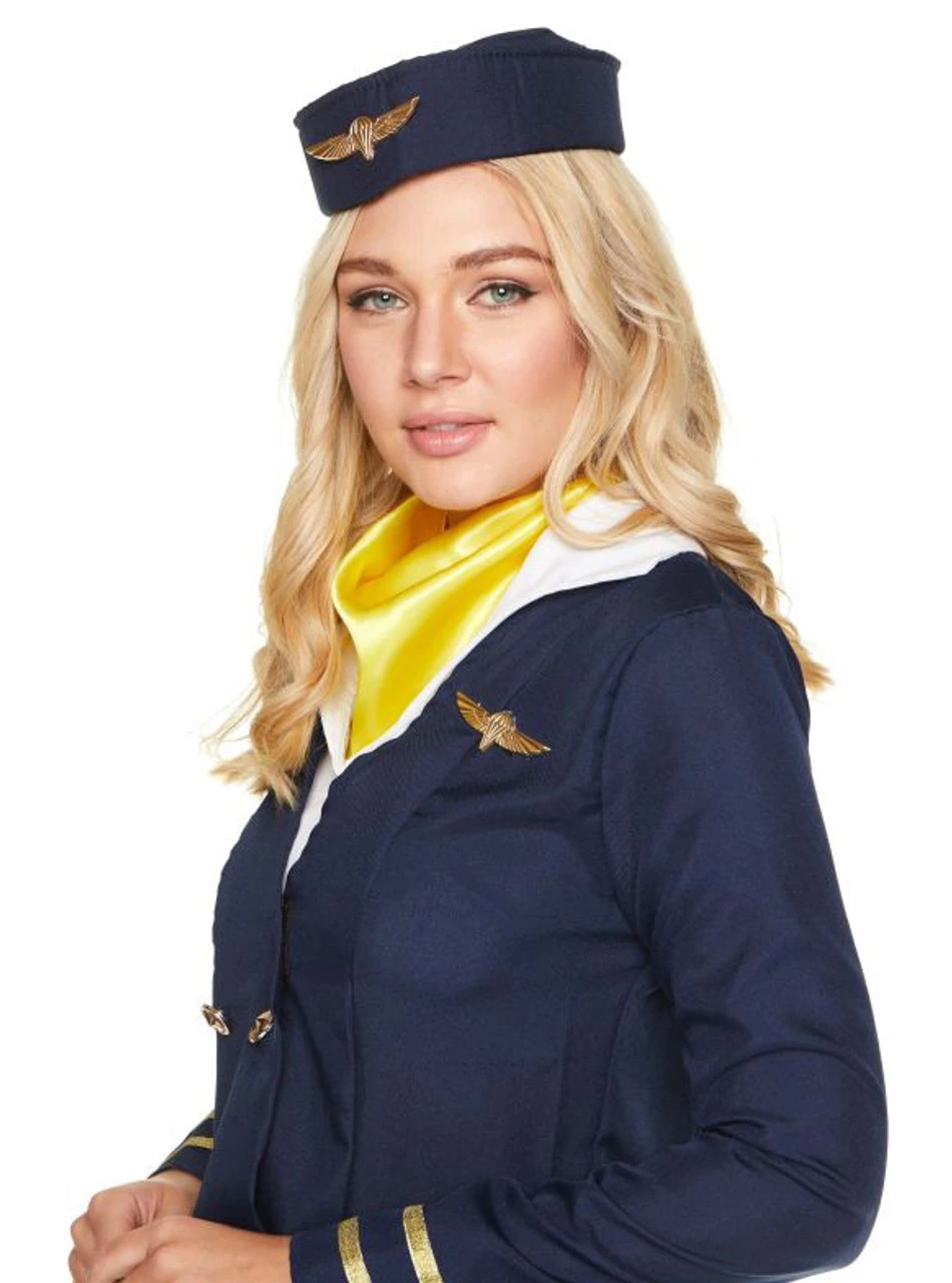 Envolez-vous haut dans le ciel dans ce Costume Hôtesse de l’Air Bleu pour Femme! Envolez-vous vers le ciel dans ce costume bleu marine épuré comprenant un blazer à rayures dorées sur les manches, une jupe crayon assortie, un empiècement de chemise et un foulard jaune clair. Complétez ce look professionnel avec le chapeau d’hôtesse de l’air bleu marine inclus et envolez-vous directement dans vos rêves dans cet incroyable costume d’aviation!