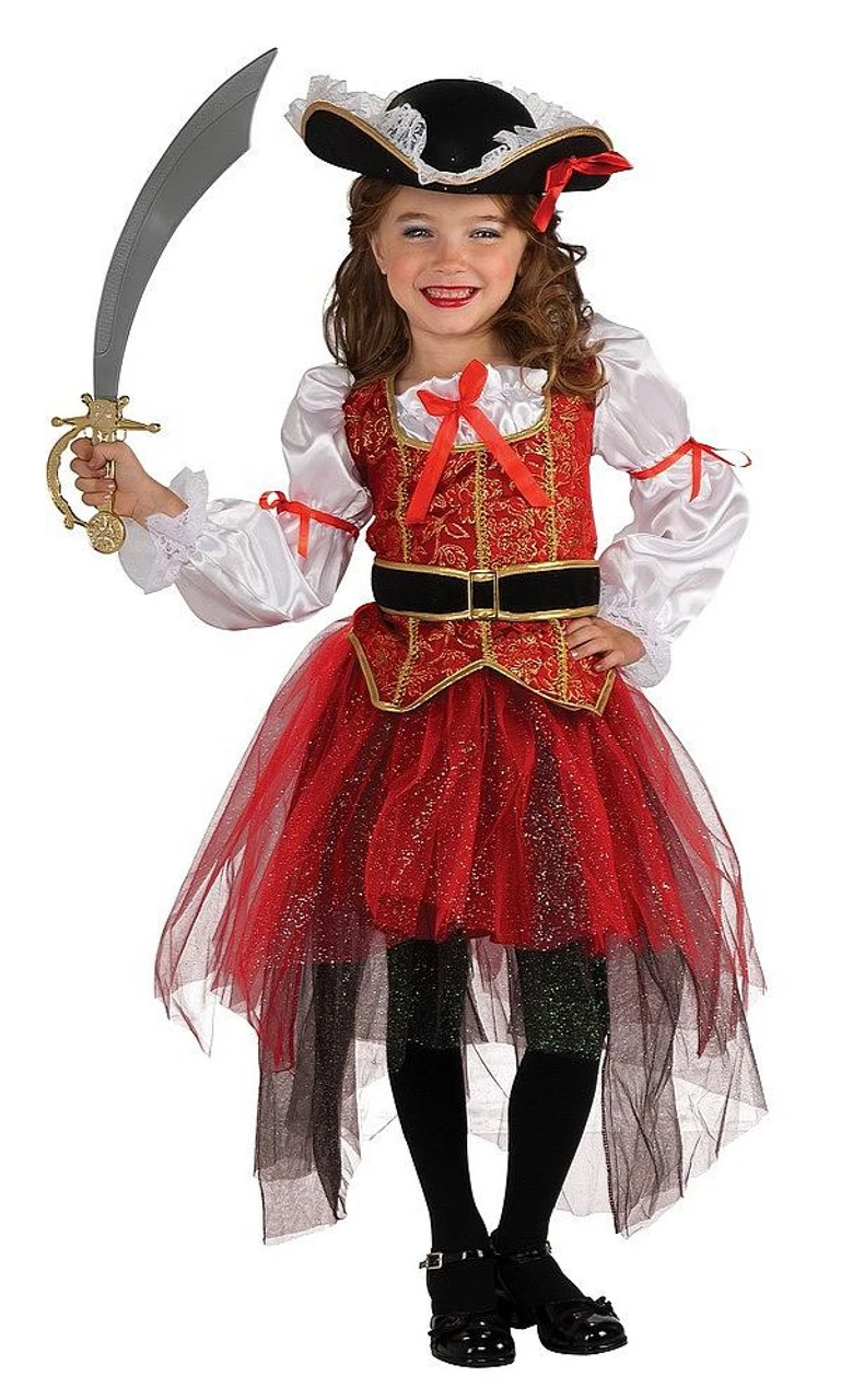 Votre petit boucanier mettra les voiles vers la haute mer dans ce chic Costume de Pirate Princesse des Mers! Soyez prêt à monter à bord avec ce Costume de Pirate de la Princesse des Mers comprenant un charmant haut rouge et blanc style pirate avec une jupe totalement superposée, une veste rouge avec des garnitures en or assortie avec une ceinture noire, des nœuds rouges sur les manches et la poitrine, le tout complété par un chapeau de pirate avec des garnitures en volant blanc et un nœud rouge sur le côté. Votre tout-petit va sûrement avoir du plaisir avec cet impertinent costume de la Princesse des Mers qui vient avec: