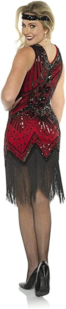 Impressionnez tout le monde à la fête avec ce Costume de Robe Écarlate à Perles magnifiquement complexe ! Cette robe flapper rouge et noire est ornée de superbes détails perlés (sur le devant et le dos !) et d’une frange noire. Ajouter des accessoires (non inclus) pour compléter le look!
