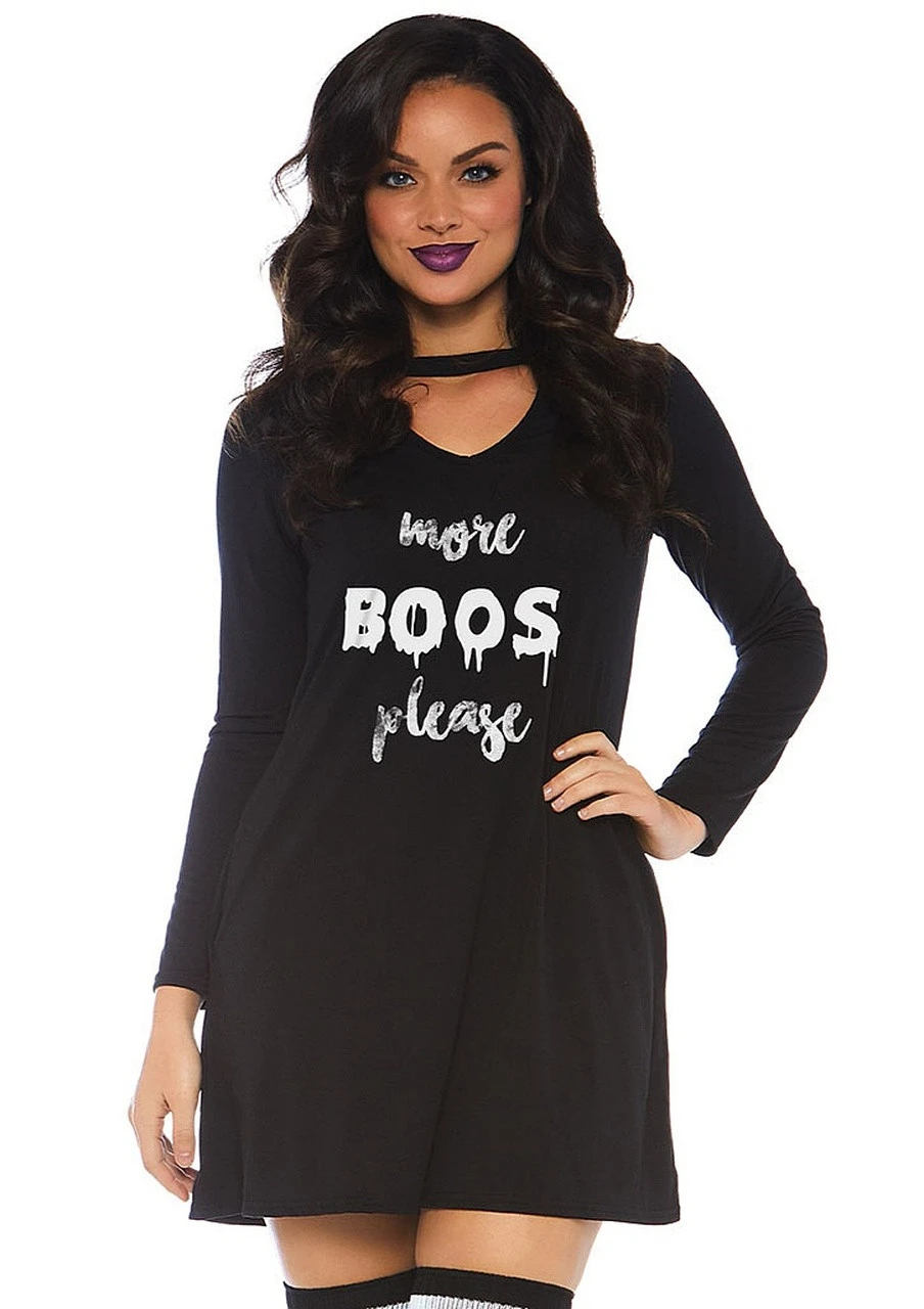 Cette robe noire en jersey avec des poches et un décolleté découpé est décorée de la phrase « more boos please » (jeu de mots sur more boos – plus de bouhs ! et more booze – plus d’alcool) et sera parfaite pour une fête d’Halloween. Portez-la avec un chapeau pointu et des bas de sorcière (non compris) !