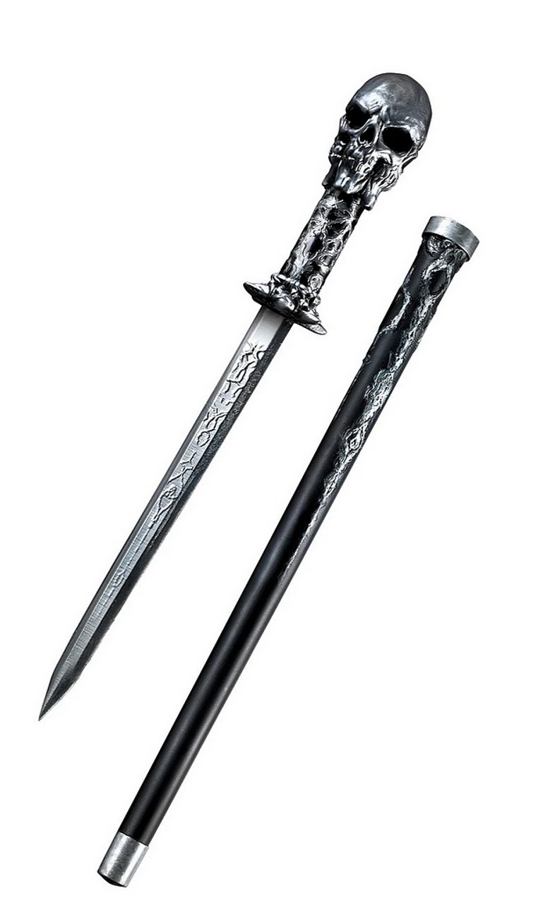 Tonight everyone will fear your evil presence to avoid a deadly duel with you. The Skull Cane Sword will add a sinister and mysterious air to your costume, with its skull detailed hilt, cursed blade and dark and extravagant sheath with engraving detail. The sword can easily be combined with a large array of costumes and will make a hit out of any Dark Lord costume. The Skull Cane Sword includes: