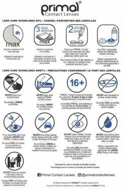 *Primal Contact Lenses est une entreprise canadienne et ses lentilles sont conformes aux rĂšglements de SantĂ© Canada ainsi qu’Ă la Loi canadienne sur la sĂ©curitĂ© des produits de consommation (LCSPC)