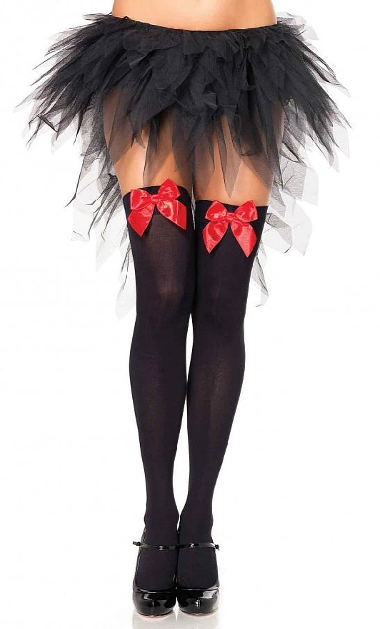 Complétez votre tenue rouge et noire avec ces bas noirs à nœuds rouges, simples et séduisants.