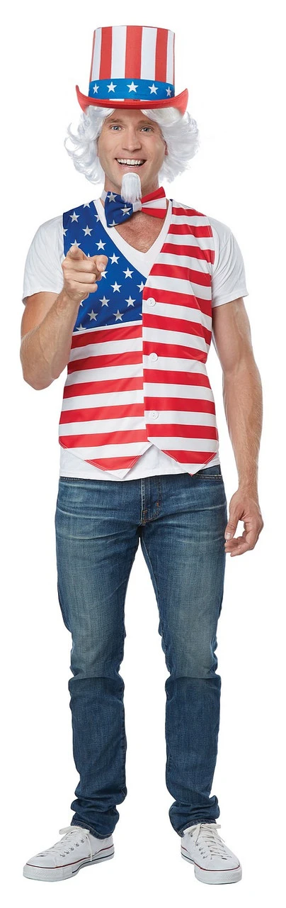 L’Oncle Sam serait fier de vous avec ce kit de patriote américain pour homme. Ce kit aux couleurs de la bannière étoilée comprend un veston, un chapeau haut de forme, et un nœud papillon, tous décorés du drapeau américain, et sera parfait pour votre fête du quatre juillet. Si vous vous sentez particulièrement patriotique, vous pouvez rajouter des colliers rouges, blancs, et bleus et des lunettes de soleil.