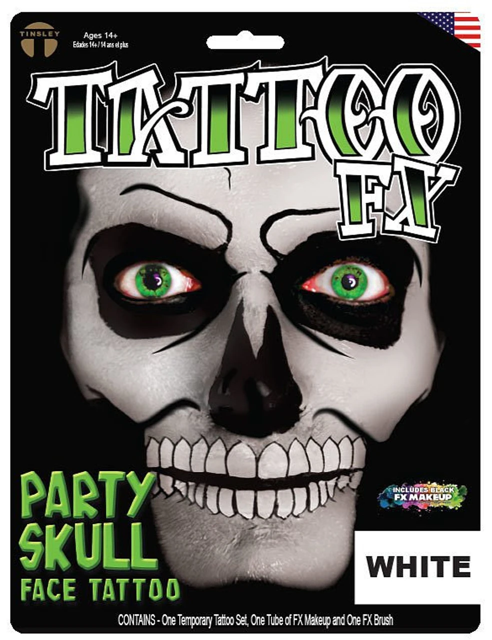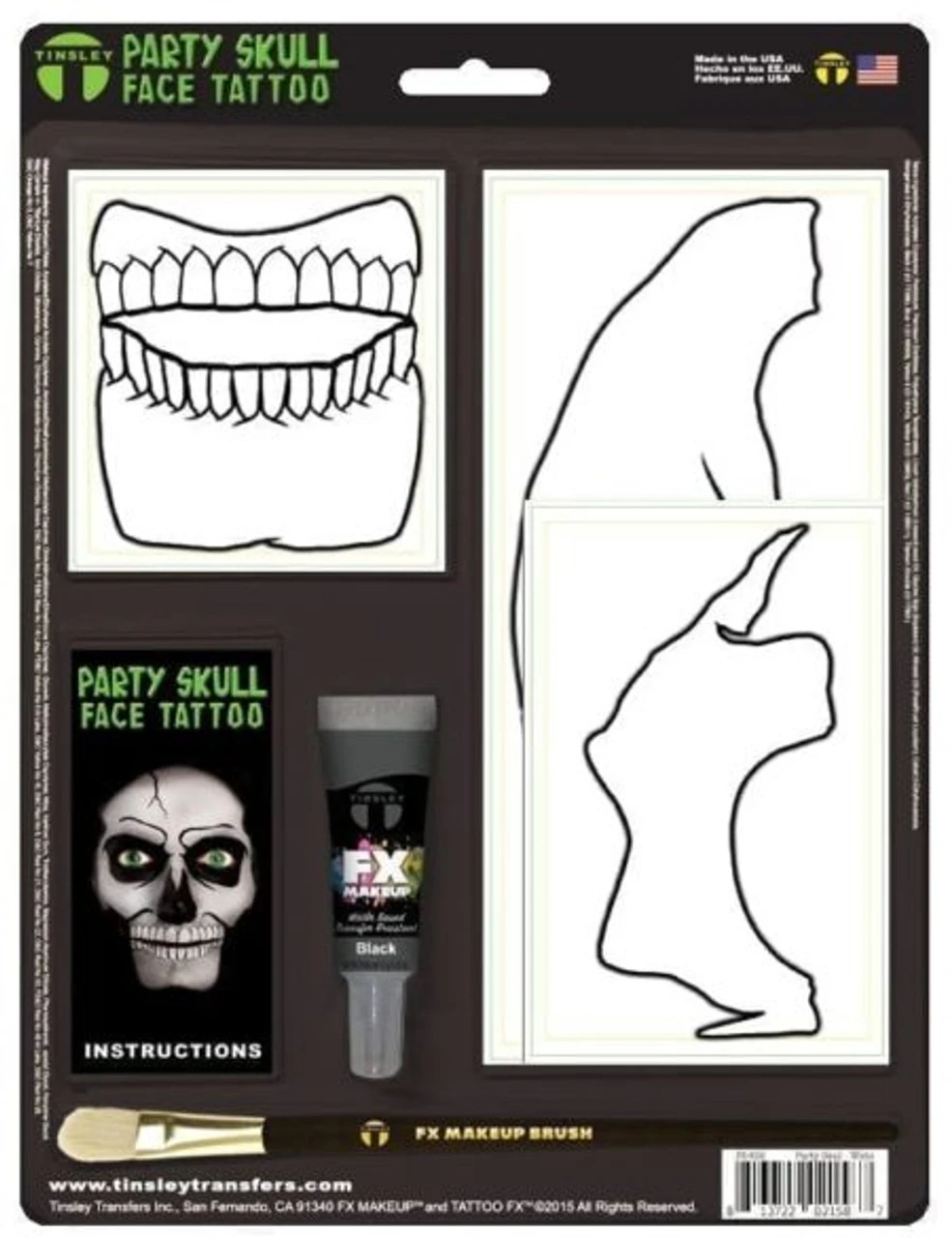 Transformez-vous instantanément en squelette avec ce maquillage Party Skull Blanc ! Il est livré avec un transfert de tatouage, un tube de maquillage FX et un pinceau à maquillage
