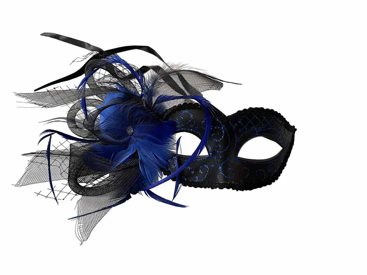 Un superbe masque de mascarade noir avec des plumes bleues et un voile ornĂ© de fleurs bleues, d’accents en tulle noir et de plumes bleues. Il est dĂ©corĂ© de paillettes bleues assorties.Â