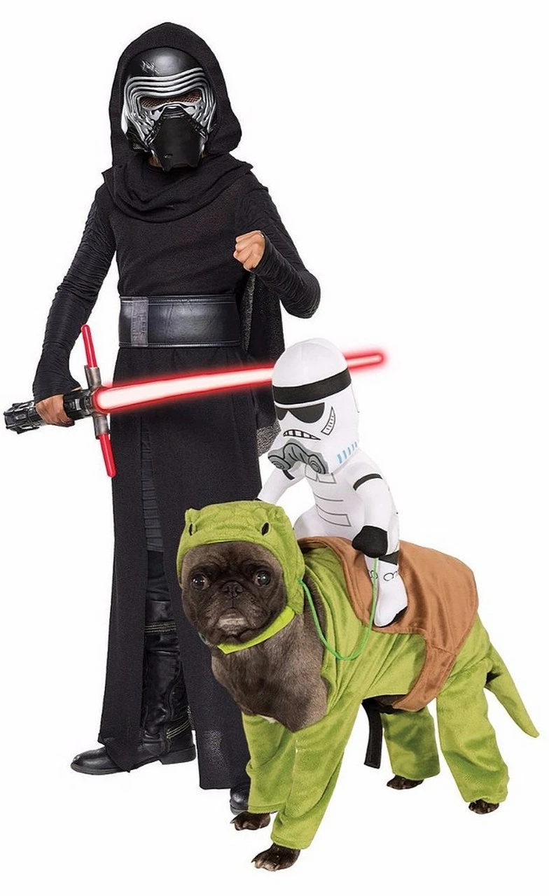 May the Force be with you… and with your pet! You’ll be a hit this Halloween with this set of Star Wars costumes, featuring a Deluxe Kylo Ren Costume and a Star Wars Dewback Dog costume featuring an attached clone rider.